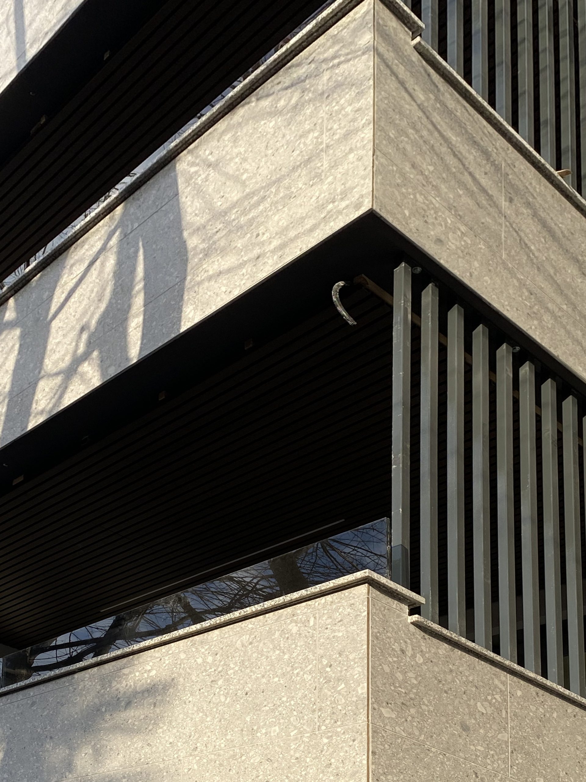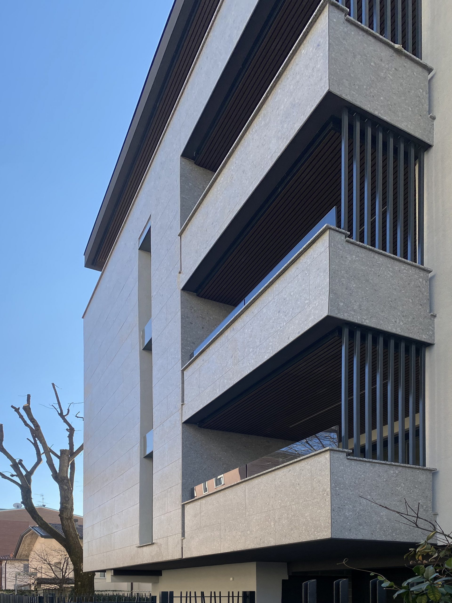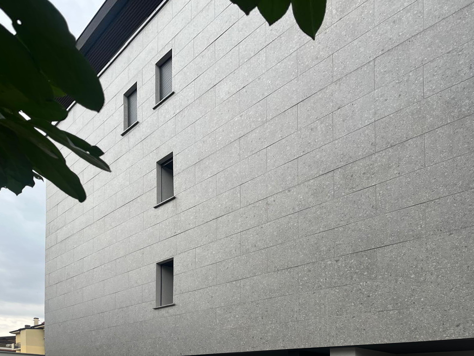La scelta della finitura esterna non è casuale. Il rivestimento in gres porcellanato effetto Ceppo di Gré conferisce all’edificio una matericità solida ed elegante. La texture ricca e naturale della “pietra” dialoga con la precisione tecnologica del sistema di facciata, creando un equilibrio tra tradizione costruttiva locale e innovazione. Questa soluzione assicura che l’edificio mantenga la sua bellezza inalterata nel tempo, resistendo allo smog e agli agenti atmosferici, un fattore chiave per la valorizzazione dell’investimento immobiliare nel lungo periodo.